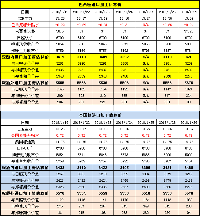 1月29日巴西泰国原糖升贴水、运费及加工成本