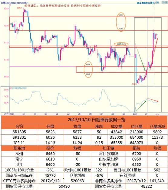 国内情况:国内市场,稳定的现货报价给市场参与者以信心,南宁现货报价继续维持在6610元/吨,昨天我们强调期现基差并结合持仓分析指出,现货席位大幅增多,这也是符合其交易逻辑的。一般而言,当基差正值远超正常值并不断扩大时,现货企业尤其是手中仍有现货的,高位卖出现货的同时低位从盘面接回,这一方面处理陈糖,回笼资金、节省仓储及财务费用,另一方面则可以以旧换新,不承担陈糖贴水的损失。资金方则是依据形态及长期走势继续看空做空,但是期价逼近前底5993,技术上一是存在抄底可能、二是上述分析原因,因此期价在重上6062及6090后,空头现出溃败迹象,上述两个位置也是我们昨天及时跟踪调整的止盈和离场位置。从盘面上看,期价重新站上6090后快速减仓反弹,这也是符合空头控盘行情特征的。