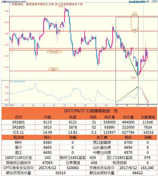 技术上看,郑糖1801跌穿6135-6140关键位置后,继续向下跌破6080,但是我们昨天特别强调,如果跌破重要支撑位置后,不出现继续增仓下杀,则要主动减空为主。周三的盘面也恰印证了这一点,早盘开盘后承接前夜跌势继续增仓杀跌,但是期价于6080之下开始出现明显的增仓趋缓,随后重上6080后步入减仓反弹的节奏。这也是极为明显的空头控盘特征,也是近期盘面的十分清晰的特点。