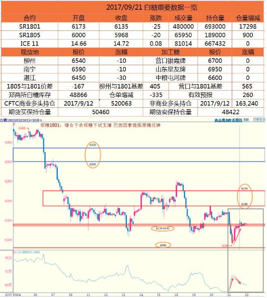 就盘面而言,资金的选择更重于形态,俗话说价格总是向阻力最小的方向行进,近期郑糖1801在6186上下震荡,而该位置也越来越清晰的成为近期弱势震荡区域的强弱分界线,因此我们昨天建议在此位置之下注意捕捉做空机会。盘中主力背靠6186增仓下杀,期价跌破6160后便一路增仓下行,再次跌穿6135-6140近期重要支撑后直逼6080(前期我们分析过6135-6140之下的支撑便是6080)。主力于此两度下试后未能再有斩获便获利了结,期价重新站上6110后重回6135-6140一带消化掉了半数以上的日内新增持仓。夜盘基本维持在较为狭窄的幅度内调整,持仓几无变化。