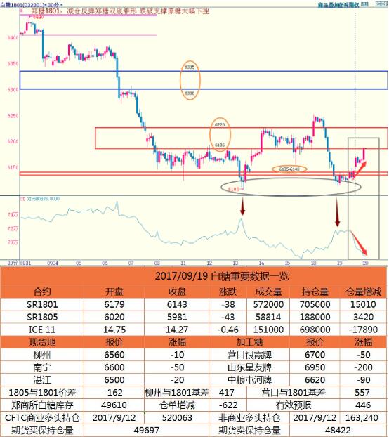 操作建议:近期郑糖1801围绕6186上下震荡,增仓压制或杀跌、减仓反弹是盘面的主要特征。这种拉锯战较适合短线操作,中长线则倍受煎熬。建议盘中仍以关注持仓变化为主,不出现大举增仓的情况下,无论上突、下破均难以持续,盘中出现大举增仓则可少量跟随操作,注意在前低附近的主动减仓或出现减仓时及时减持或了结空单。谨慎的交易者建议观望为主,切勿追涨杀跌。
