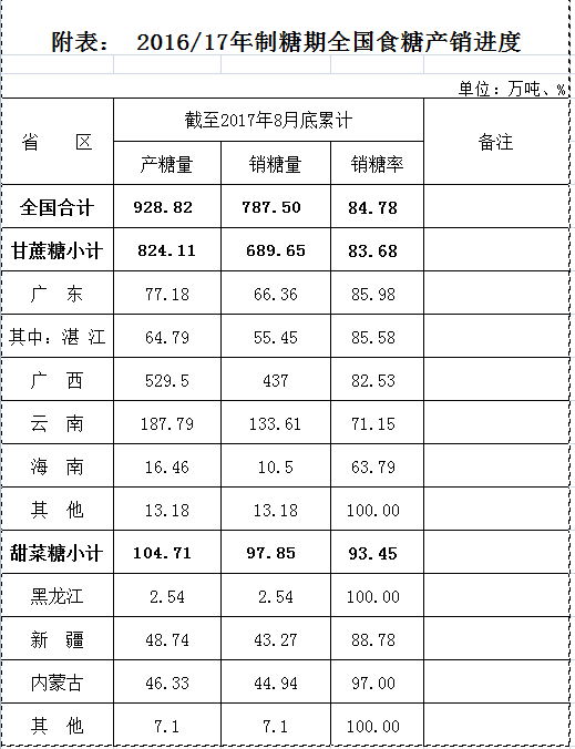 截至2017年8月底,本制糖期全国累计销售食糖787.5万吨(上制糖期同期726.88万吨),累计销糖率84.78%(上制糖期同期83.53%),其中,销售甘蔗糖689.65万吨(上制糖期同期651.38万吨),销糖率83.68%(上制糖期同期82.96%),销售甜菜糖97.85万吨(上制糖期同期75.5万吨),销糖率93.45%(上制糖期同期88.84%)(见附表)。