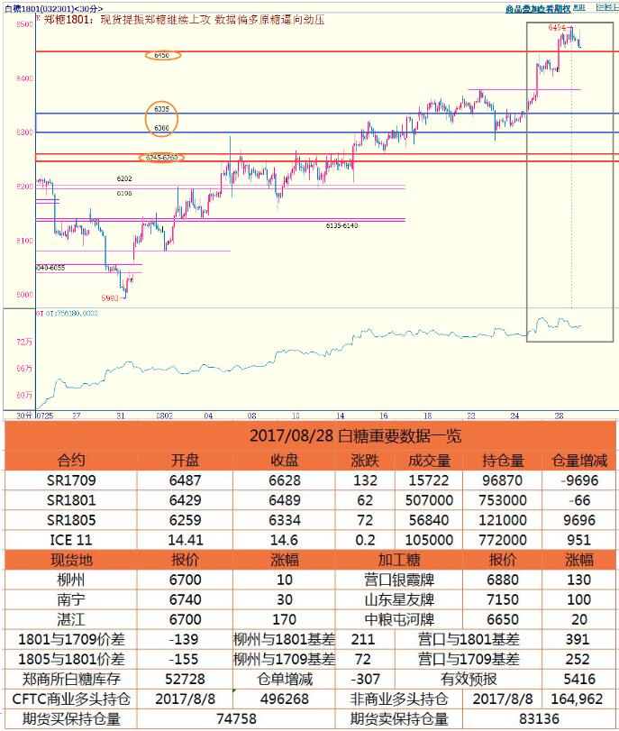 技术上看,郑糖1801在达到第一反弹目标位6450后并未终止反弹步伐,周一早盘继续增仓上攻并突破6450重要压力后,向6500整数关口突击。结合图形及持仓分析,郑糖1801自向上突破6300-6340压力区域后,其两次强有力的上攻均是先增仓拉到一定位置后即开始高位拉锯消化持仓,短线行为较为明显,持仓先增后减,累积增仓并不是很多,主要是以打开空间为主,这一点跟之前郑糖1709在6630之下的动作极为相似,只是方向是反向的。