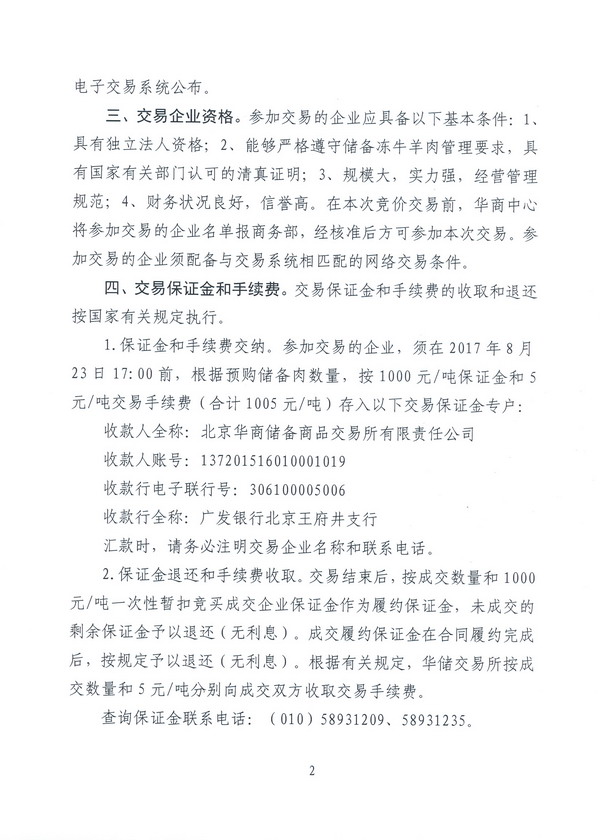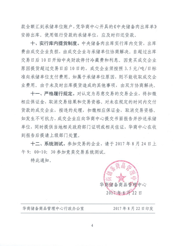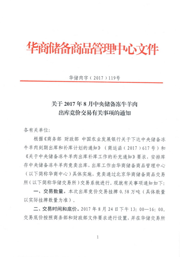 关于2017年8月中央储备冻牛羊肉出库竞价交易有关事项的通知
