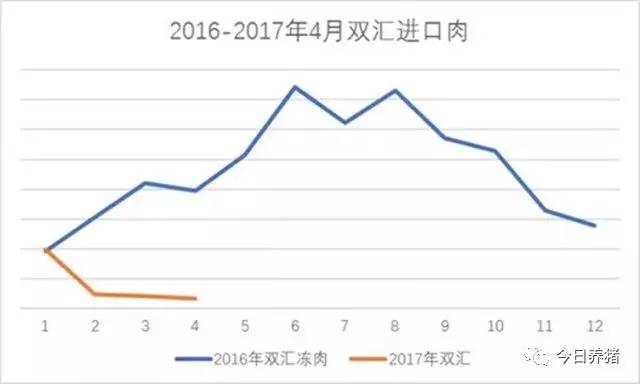 蓝色代表2016年双汇进口猪肉量走势,橙色代表2017年双汇进口猪肉量
