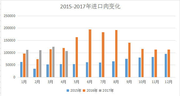 如上图所示,是近三年来进口肉的变化,其中进口量在16年发生了翻天覆地的变化,基本实现了倍增,而在17年前几个月份则表现为较16年小幅度增加。但这个增加在4月份发生了变化,据海关数据显示,今年4月份进口鲜冷冻猪肉106461.984吨,环比减少14.16%,同比减少10.23%。