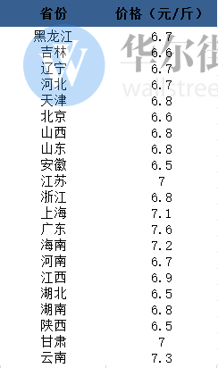据搜猪网数据,今日全国瘦肉型猪出栏均价6.77元/斤,较昨日下跌0.03元/斤,较去年同期10.46元/斤下跌3.69元/斤。下表为各猪肉食用大省的猪肉均价。从表中可以看出,除江苏、上海、海南、广东、甘肃和云南以外,其他各省的猪肉价格都在7元/斤以下。其中江苏、上海和甘肃的均价在7元/斤徘徊。