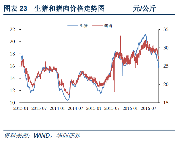 据华创证券分析,首先,在猪肉价格连续下降的背景下,养猪行业之所以还能保持在盈利区间,是因为猪饲料价格持续下降。但猪饲料价格已连续下降3年,养猪行业的成本下降的趋势不可持续。其次,养猪行业惜售情绪仍未散去。2016年猪崽价格高,养殖户们扩大养殖的成本大,到2017年猪肉价格下降时养猪人不愿出售,导致市场上的猪肉存量仍大。其三,规模厂仍在扩大生猪养殖量,挤占散户们的市场份额。