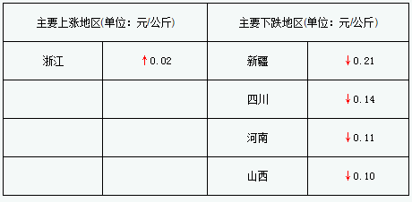 今日全国27省、直辖市范围内,共计1省份猪价上涨,25省份猪价下跌。全国最高价为江苏,较昨日下跌0.08元/公斤于15.00元/公斤;全国最低价为新疆,较昨日下跌0.21元/公斤于13.27元/公斤。湖南与昨日持平。