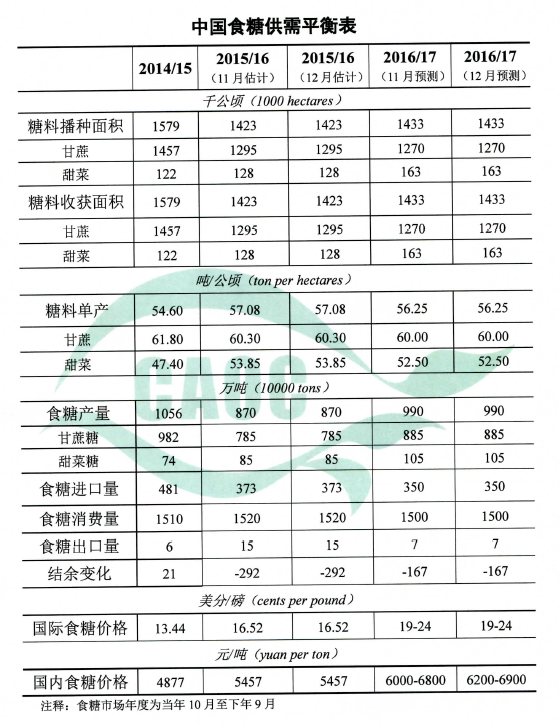 上月报告考虑到糖价上涨对食糖消费有一定的抑制作用,对2016/17年度中国食糖消费量较上年度调减20万吨至1500万吨,本月暂与上月保持一致。