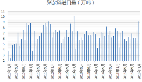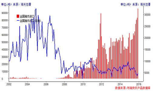 2016年1月份我国猪肉进口量达到了9.7万吨,进口CNF价格为1907美元/吨(折进口完税价格15.7-16元/公斤),3月份国内猪价飙升至18.2元/公斤左右,折算白条(含杂碎及猪头部分)成本达到23.5-24元/公斤。巨大价差,猪肉进口继续增加,预计全年进口量超过100万吨。