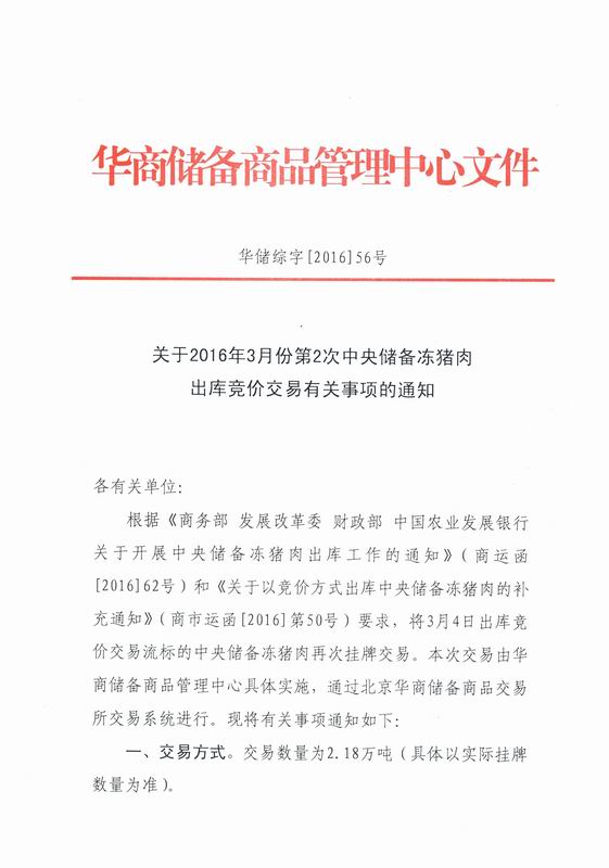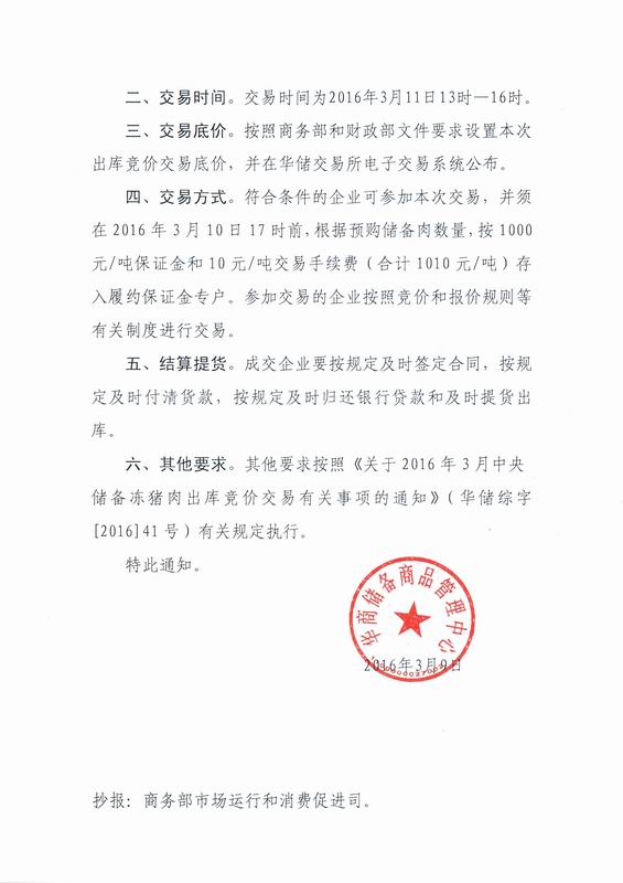关于2016年3月份第2次中央储备冻猪肉出库竞价交易有关事项的通知
